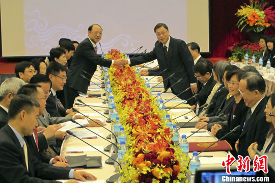 中新網12月10日電 據臺灣“中央社”報道,兩岸經濟合作委員會第5次例會今天(10日)在臺北召開,臺灣海峽交流基金會副董事長高孔廉與大陸海峽兩岸關系協會副會長鄭立中都在致詞時,表達生效實施兩岸服務貿易協議的期盼。