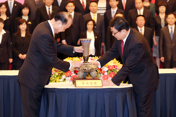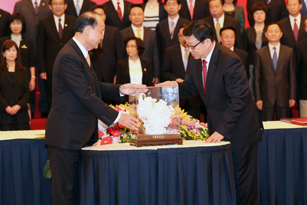 25日上午,海協(xié)會、臺灣海基會領(lǐng)導(dǎo)人第十一次會談在福州舉行。當天下午,雙方簽署了《海峽兩岸民航飛行安全與適航合作協(xié)議》《海峽兩岸避免雙重課稅及加強稅務(wù)合作協(xié)議》,圖為臺灣;鶗麻L林中森向海協(xié)會會長陳德銘贈送禮物。(中國臺灣網(wǎng) 何建峰 攝)
